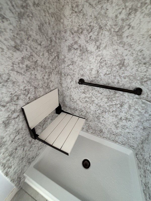 Luxury Bath of Central Florida transformed this shower into a safe, stylish, and accessible space featuring a low-threshold base, fold-down bench, marble-patterned walls, and oil-rubbed bronze fixtures—combining modern design, comfort, and safety for an elegant bathroom upgrade.
